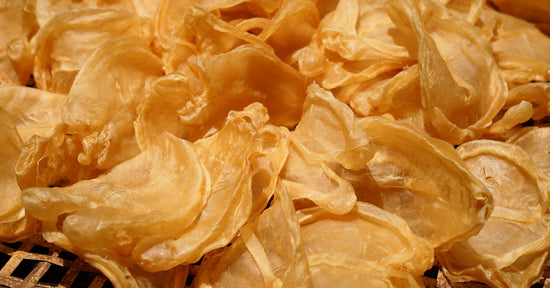 花膠是中國傳統名貴食材之一,是由魚鰾製成的珍品,「鮑參翅肚」中的「肚」正是指花膠。常見於高級粵菜料理中,含豐富膠原蛋白、多種維生素等。